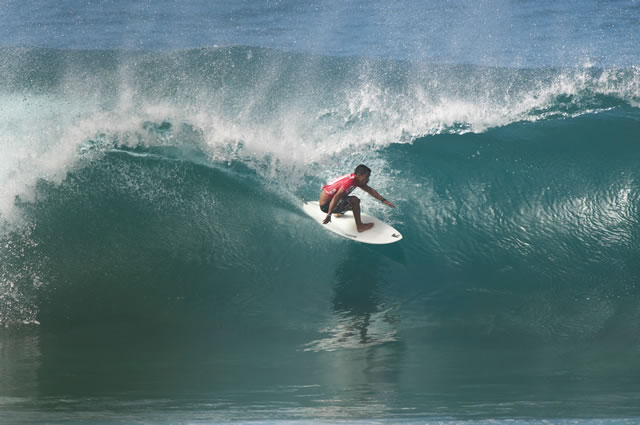 そして、今回は今まで聞いたこともないブラジリアンがデビュー・イベントでショーを独占した。それはブラジルのバヒーア出身の25才、デニス・ティハラ。ティハラは前にパイプでサーフしたことはあるが、コンテストは初めてで今日の最高ヒート・スコア17.4をスコアした。
