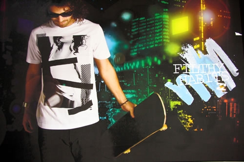 スプリングサマーからの流れを汲むHSメインアイテムのTシャツのプリント柄の傾向は、やはり昨年からの「ネオ80's」のカラーが濃く、ボディがスリムで、ブライトな幾何学模様やサイケな雰囲気なものが目立つ。また、これまで比較的ゆるめのシルエットが中心だったメンズのラインに、タイトなウエストラインを持つスリムな「フィルシー・ハビット」シリーズが登場。アート系のフォトプリントが中心のクールなデザインが話題となっていた。