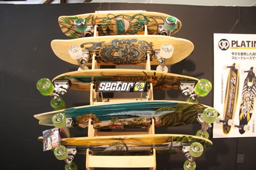 サーフィン、スノーボード、ウェイクボード等のプロライダー達によるフィードバックから、陸上でのサーフィン、スノーボード等の横乗り系エクストリームスポーツのトレーニングに適したモデル、ランプやボールなどをガッチリ攻めるモデル等、幅広くラインナップする。 また、日本人ライダーとしてヤングジェネレーション筆頭である中村昭太がSECTOR9チームに参加しすることになり、展示会場に姿を現していた。